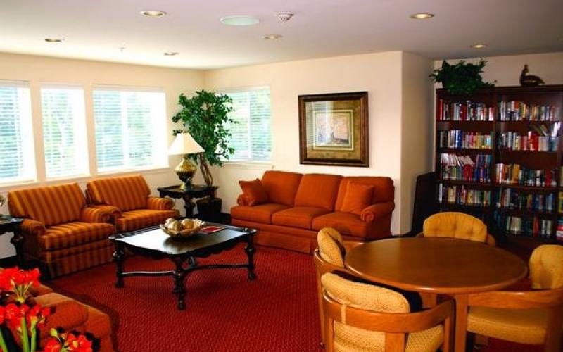The well-maintained grounds feature a patio area, garden, swimming pool and hot tub. Indoor common spaces are designed to foster engagement and include a bistro, fitness center, theater and cozy fireplace. A well-stocked library is available for book clubs or solo readers, and residents enjoy the convenience of an on-site barber shop and beauty salon, along with a large screen TV lounge.