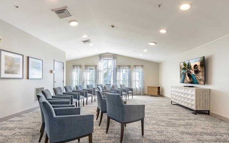 Community grounds are well-maintained and feature walking paths, a garden and a patio area. Indoor common spaces are designed to foster engagement and include a fitness center, community fireplace and activity room. A well-stocked library is available for book clubs or solo readers, and residents enjoy the convenience of an on-site barber shop and beauty salon, along with a large screen TV lounge.