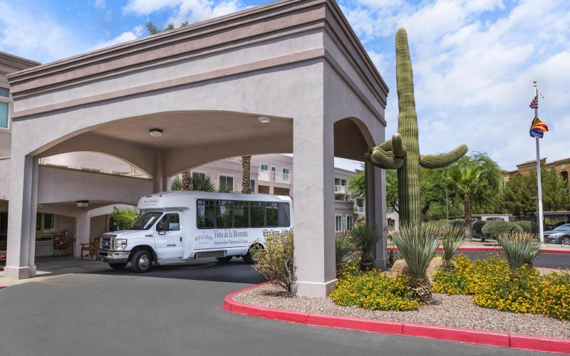 Surrounded by scenic desert landscaping and Spanish-style architecture, the community offers independent living apartments, including studio, one-, and two-bedroom floor plans. Apartments feature amenities like individually controlled heating and air conditioning, a kitchenette, and wheelchair-accessible bathrooms with walk-in showers. Select units also offer private patios and walk-in closets.