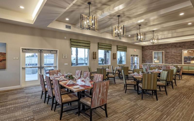 The community offers organized activities and programs, outdoor and enclosed/secured outdoor common areas, provided meals, and social activities/events. For those focused on health and wellness, activities and programs are available, including facilitated field trips/outings, entertainment activities, communal dining, fitness and wellness facilities/equipment, spiritual activities, yoga/stretching opportunities, and group exercise.