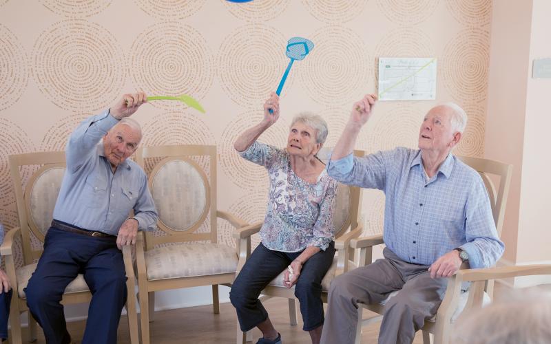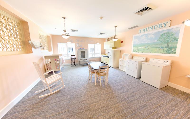 Several multi-sensory life skill centers are equipped with familiar objects, such as a rotary telephone, display train set, military uniforms, as well as vintage ovens, cabinets, cribs, and washing machines that enable residents to interact, to be stimulated, and to recall everyday life experiences.