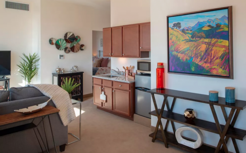 Our thoughtfully designed Assisted Living and Memory Care community is comprised of a selection of floor plans options, each tailored to the unique needs of our residents. Assisted Living residents can choose from affordable studio, one, or two-bedroom suites, while our Alzheimer's and dementia care community is made up of private studio suites. Our community features two Memory Care neighborhoods, each equipped with their own dining room, living room, common space, and shared courtyard.