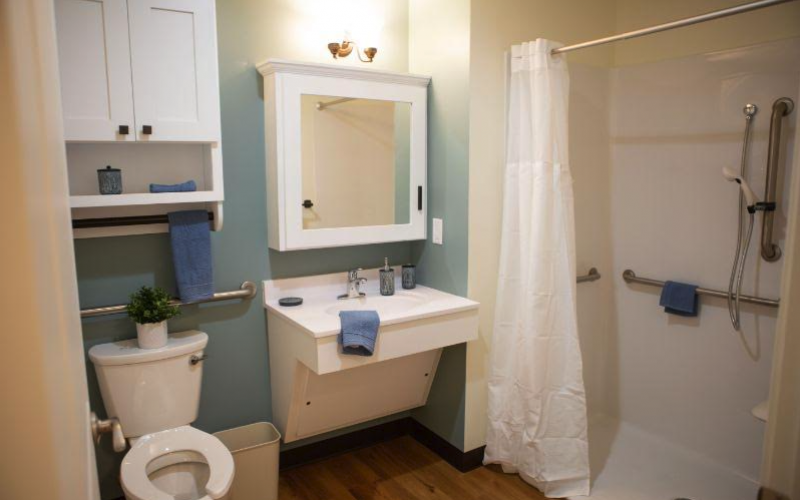 All of our suites have full baths leading to a central living area, open kitchen, dining room, library, mailroom, beauty salon, multipurpose room, and four seasons room opening to outdoor patio and garden area. Residents share meals in the common area. Family members, friends, and staff are welcome to join the community at mealtime and other activities.