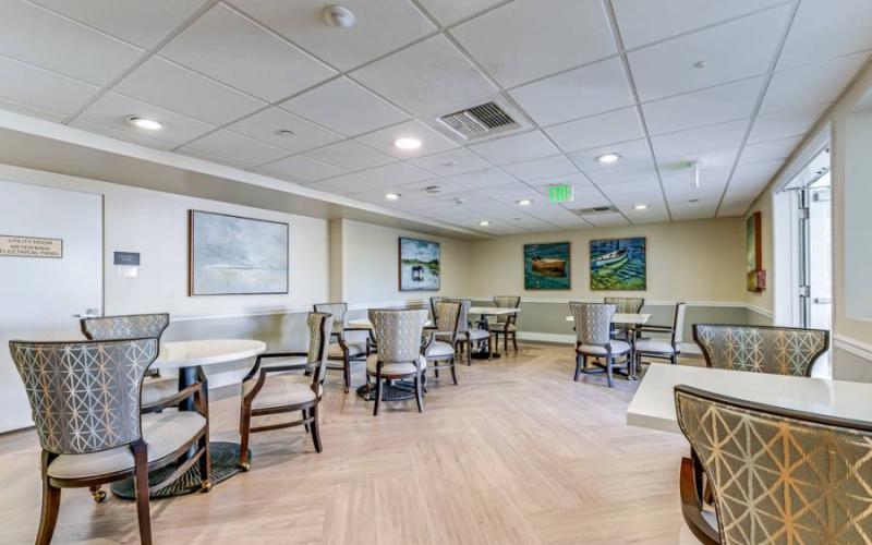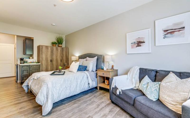 This independent and assisted living community offers studio and one-bedroom apartments with kitchenettes. Just steps away are a variety of convenient amenities and services such as a beauty salon, library and an on-site restaurant offering chef-prepared meals three times a day.