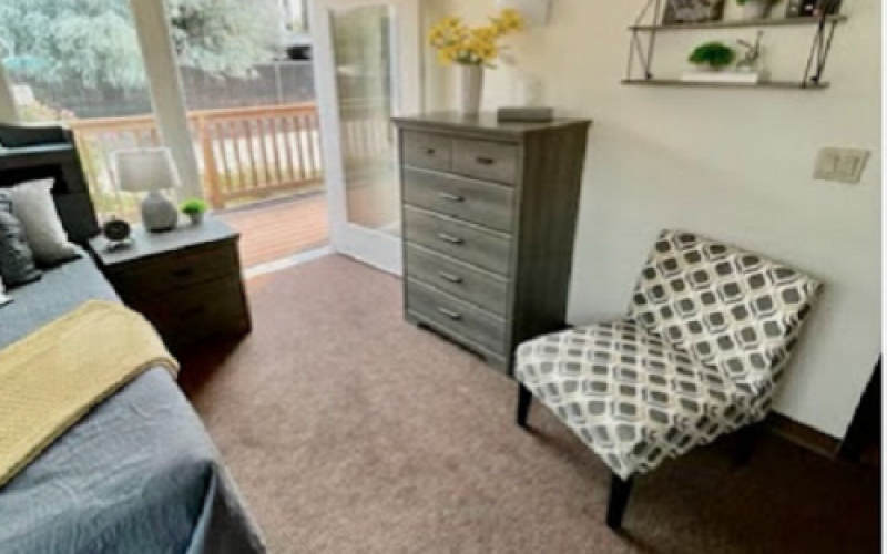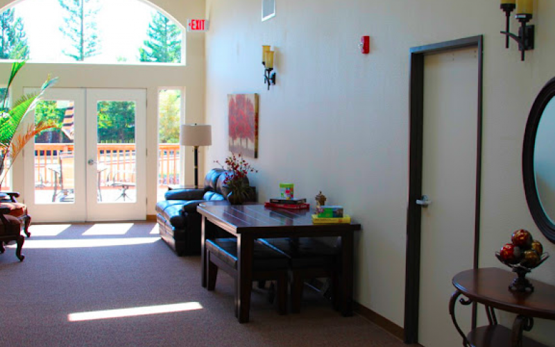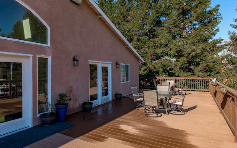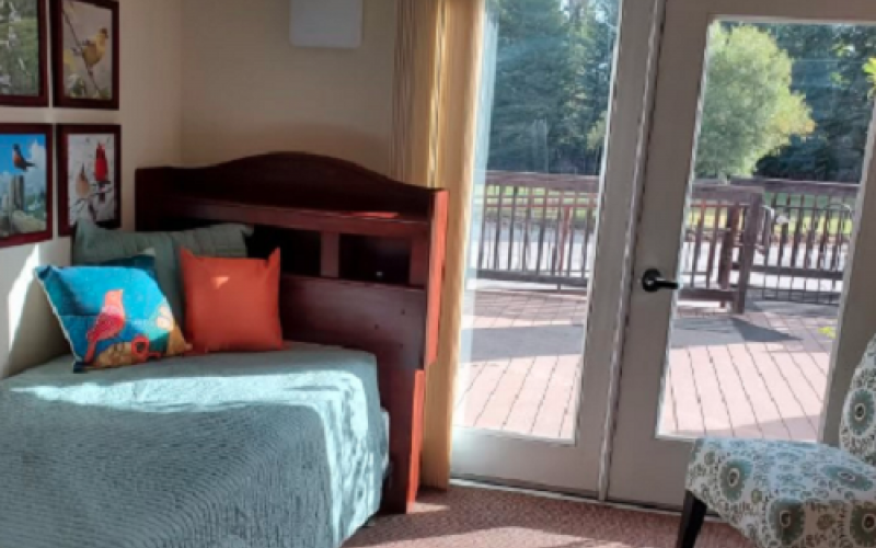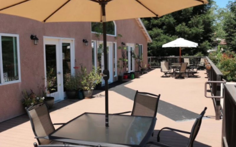 Residents and their families enjoy the feeling of home in a cozy yet open atmosphere. There is plenty of sunlight outside on the wrap-around deck, where meals are served and activities are offered, as well as the sun-filled activity room where skylights and floor-to-ceiling windows offer an abundance of natural light.