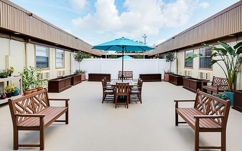 The community is thoughtfully designed to support seniors at different stages of independence while maintaining a comfortable and welcoming setting. Residents enjoy spacious common areas and inviting outdoor courtyards that feature shaded seating, open-air spaces, and garden beds where they can relax, socialize, or spend time outdoors. The secure memory care neighborhood includes a private, enclosed courtyard that allows residents living with memory loss to safely enjoy fresh air and outdoor activities.