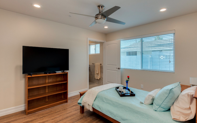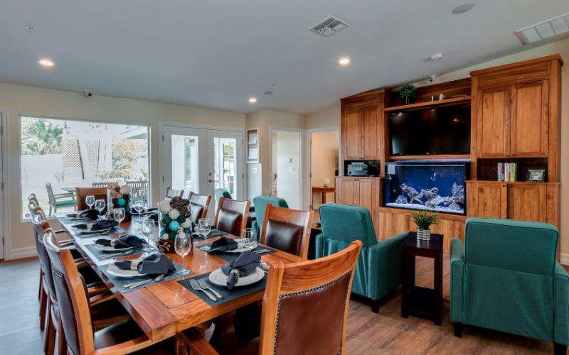 This 4,500-square-foot assisted living home has 10 bedrooms, all with private bathrooms. The open and modern kitchen connects to the living room and the dining room that looks out to Camelback Mountain. These living spaces open up to a patio and connected backyard. The living room features a large saltwater fish tank with beautiful fish and the sound of the water is soothing during activities. The backyard is perfect for a stroll and includes a garden for those who have a green thumb.